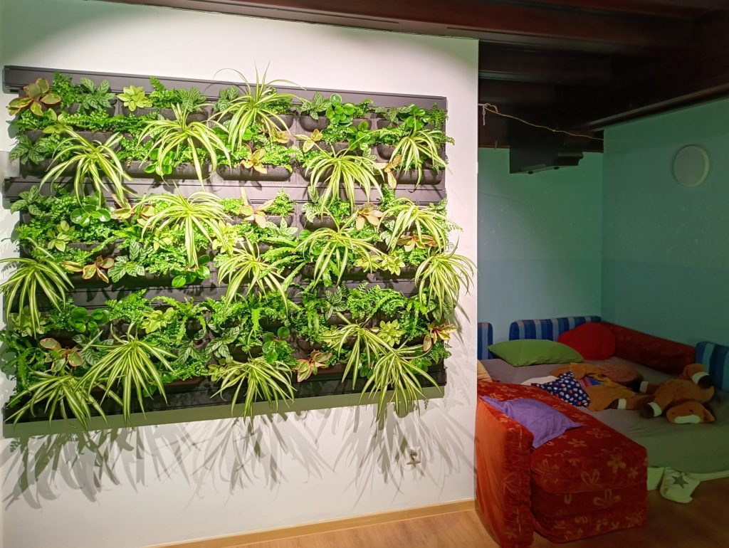 Als mögliche grüne Maßnahme, die alle genannten Ziele, die Verbesserung von Raumklima und Raumakustik und weitere positive Nebeneffekte mit sich bringt, konnte die Nutzung von sogenannten lebendigen Pflanzenwandsystemen ermittelt werden. Ein Einsatz ist für die beiden Gruppenräume geplant, da diese den Hauptort der pädagogischen Arbeit und des Aufenthaltes der Kinder innerhalb des Kindergartens bilden, hier somit der größte Effekt im Vergleich zu den sonstigen Räumen des Kindergartengebäudes erzielt wird.